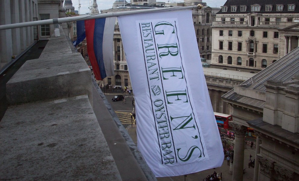 Greens Restaurant and Oyster Bar flag flying at Cornhill London.